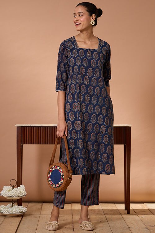 Okhai "Cypress Valley" Hand Embroidered Handblock Printed Ajrakh Pure Cotton Kurta Pant Set