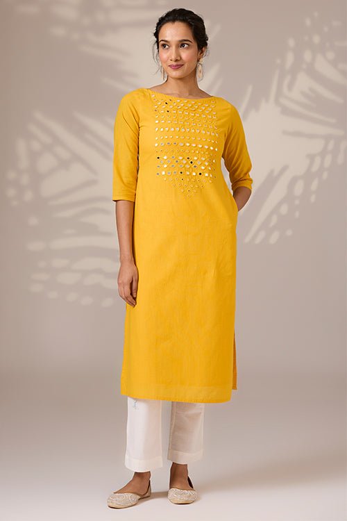 Okhai "Sunbeam Shine" Hand-Embroidered Mirrorwork Pure Cotton Long Kurta