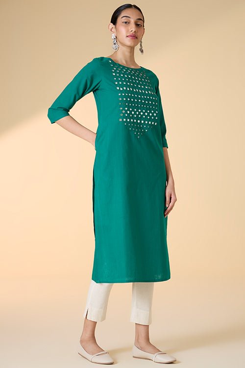 Okhai "Sarang" Hand-Embroidered and Mirrorwork Pure Cotton Emerald Green Kurta