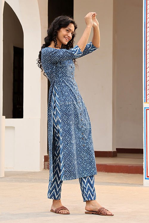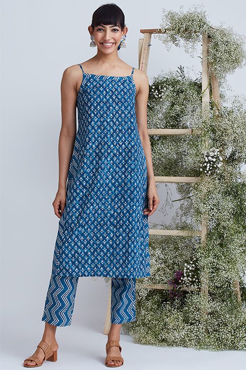 Okhai 'Indigo Sand' Hand Block Printed Pure Cotton Kurta Pant Set