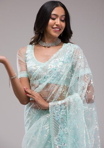 Cream Beige Floral Embroidered Saree with Sequin Work