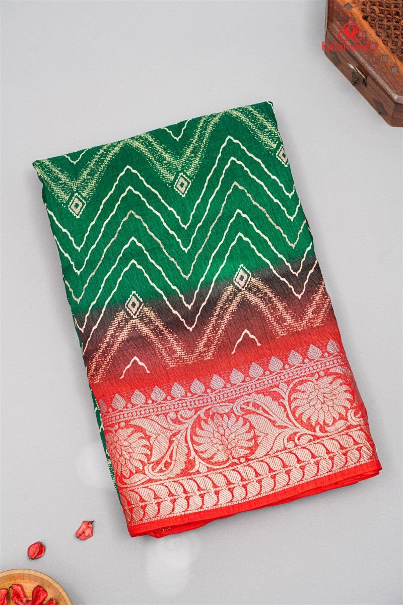 DARK GREEN and RED ZIG ZAG CRUSH CHIFFON Saree with FANCY