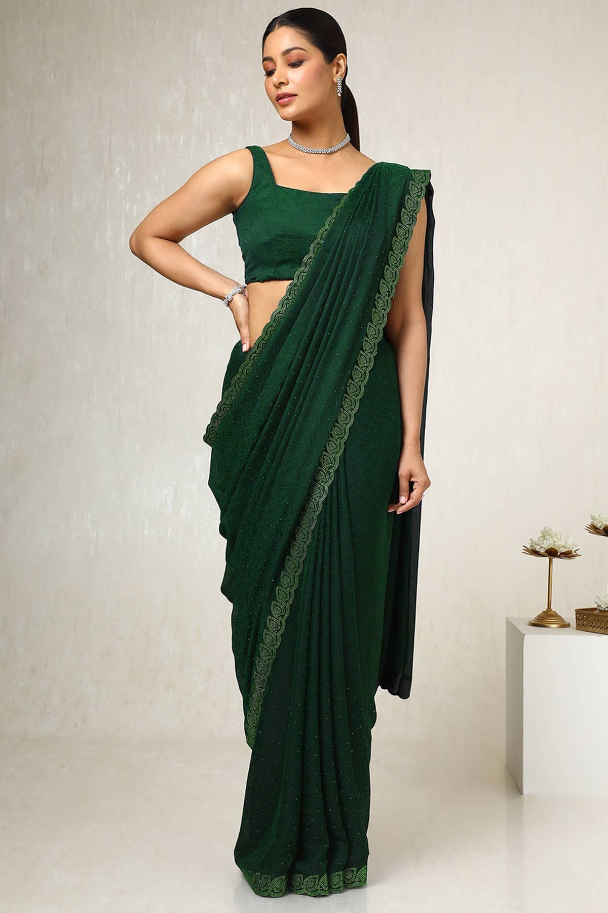 Green Chiffon Floral Print Saree With Stone Work