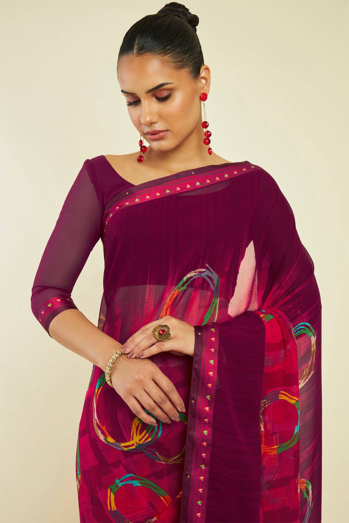 Magenta Georgette Multicolour Printed Saree With Stone Embellishments