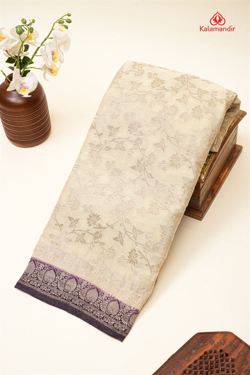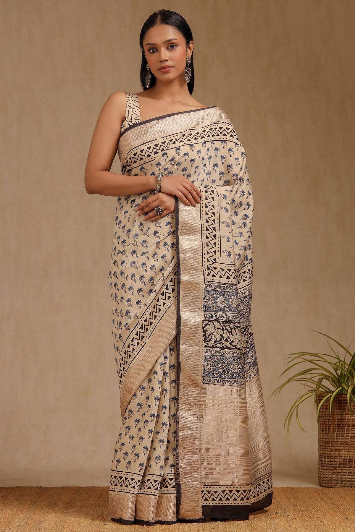 BEIGE and ROYAL BLUE FLORAL JAAL SILK BLEND Saree with SEMI PATTU