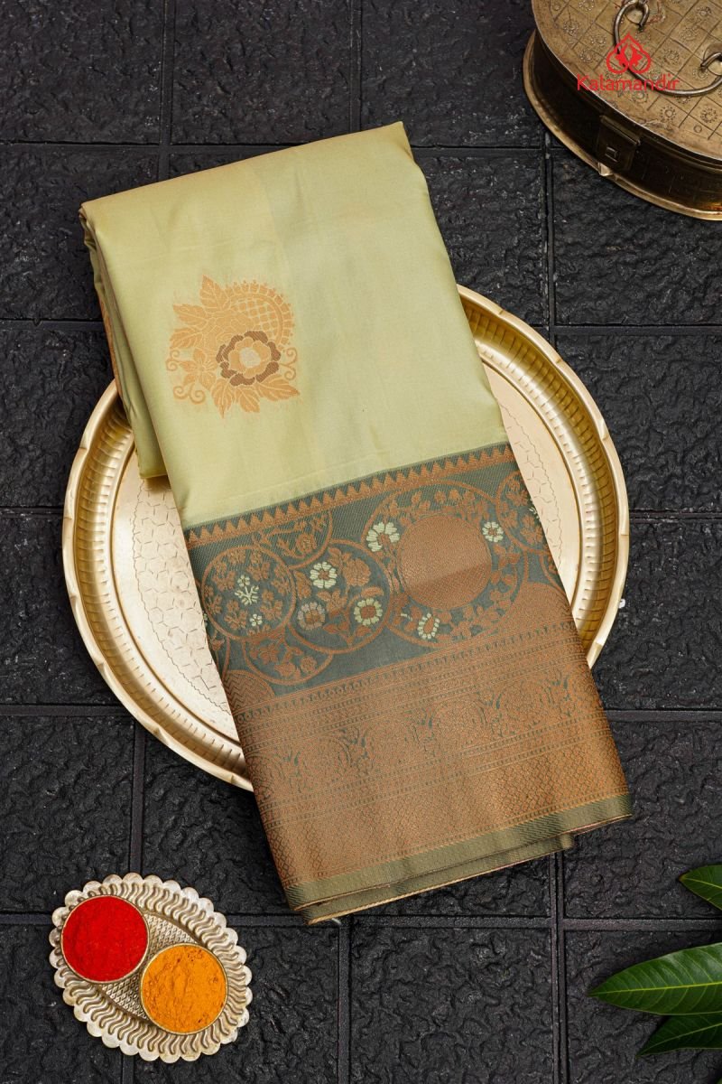 BEIGE and GREEN YELLOW FLORAL BUTTIS SILK BLEND Saree with SEMI PATTU