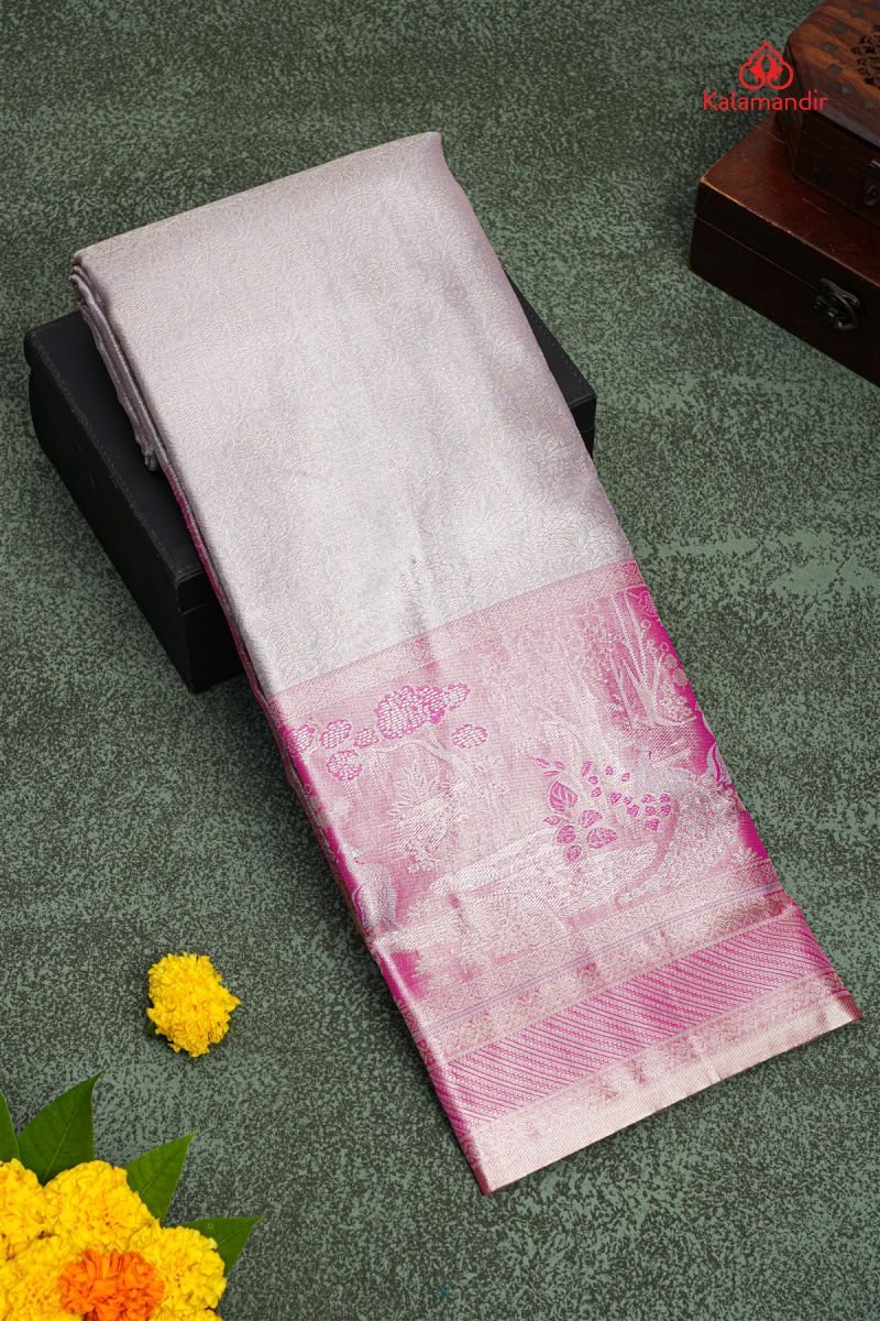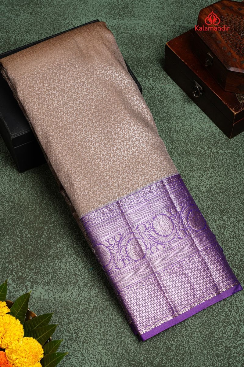 LIGHT GREY and PURPLE FLORAL JAAL SILK Saree with SEMI KANCHIPURAM