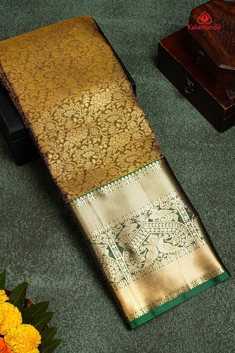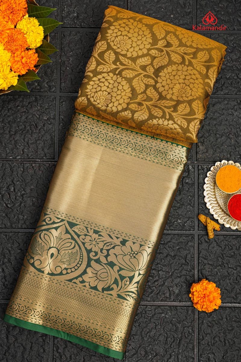 LIGHT OLIVE GREEN and GREEN FLORAL JAAL SILK BLEND Saree with SEMI KANCHIPURAM