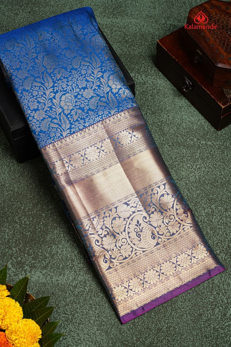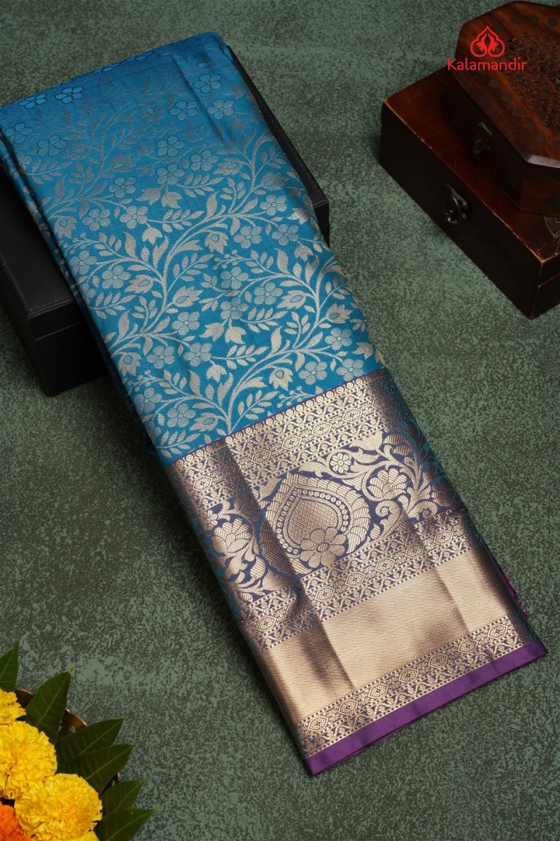 PEACOCK BLUE and PURPLE FLORAL JAAL SILK BLEND Saree with SEMI PATTU