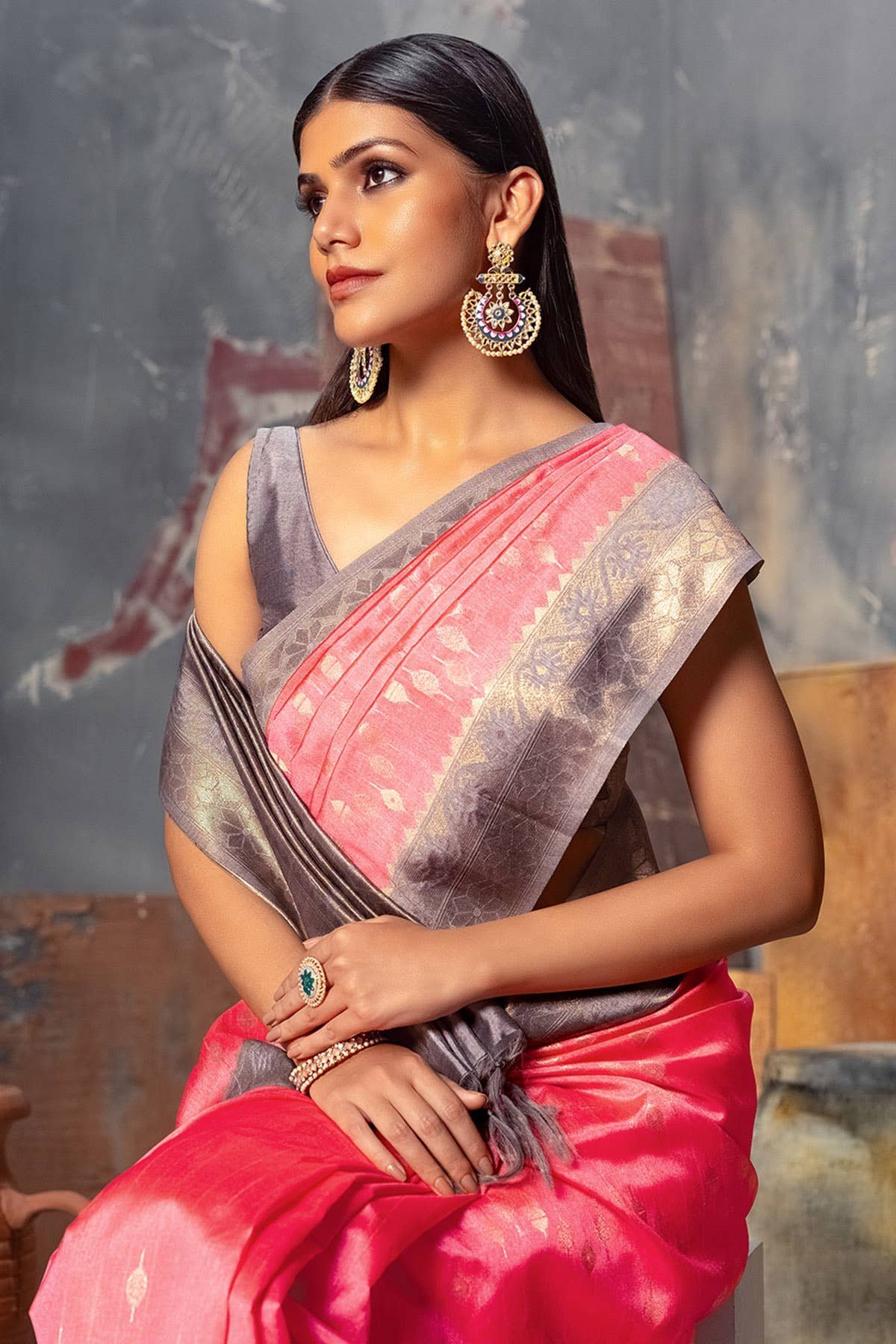 Cherry Blossom Pink Floral Patterned Zari Work Saree