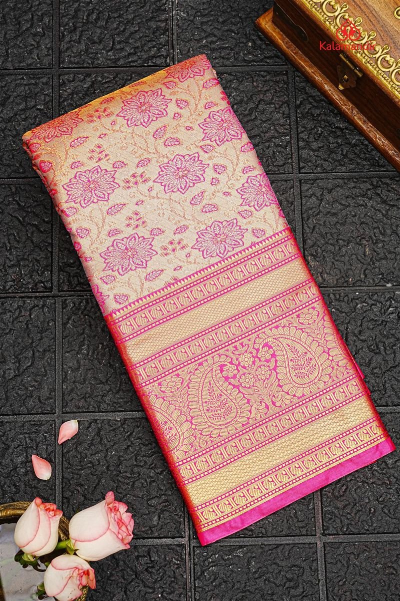 GOLD PINK and PINK FLORAL JAAL SILK BLEND Saree with SEMI PATTU
