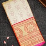 Elegant Banarasi Silk Saree crafted from pure silk with intricate zari work. Perfect for weddings, this saree includes an unstitched blouse piece for a complete look. Handwoven in Varanasi.