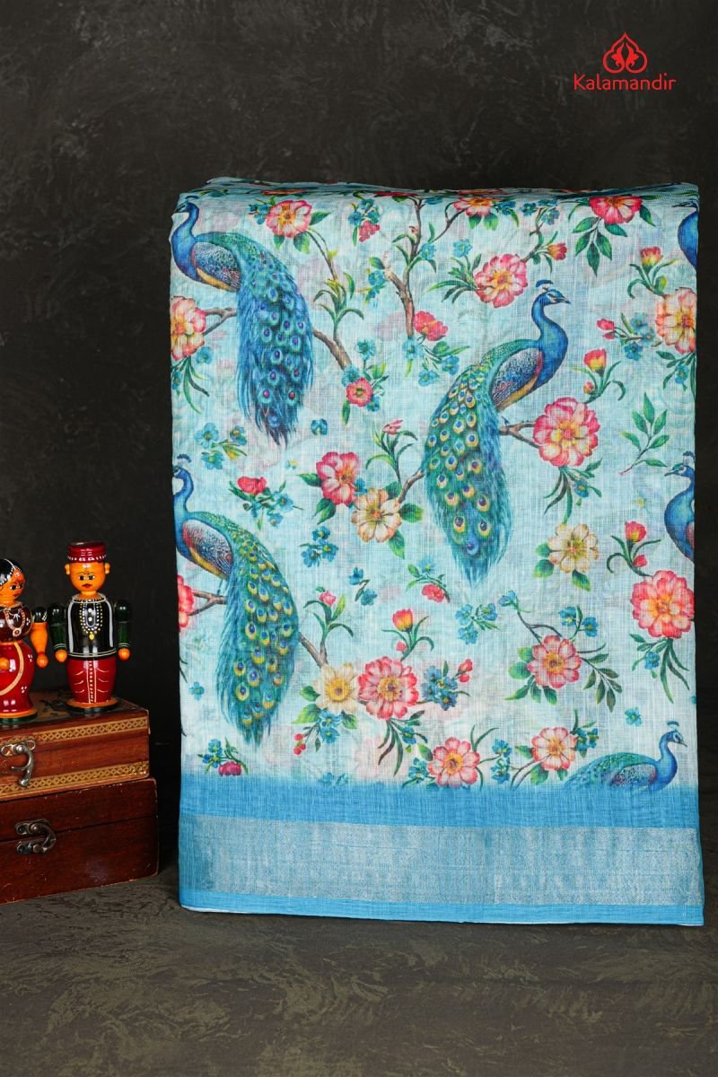 MULTI and BLUE FLORALS & FIGURES LINEN Saree with FANCY