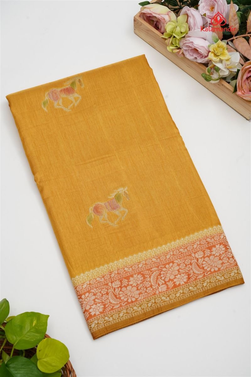 MUSTARD and RUST FIGURE PRINTS SILK Saree with BANARASI