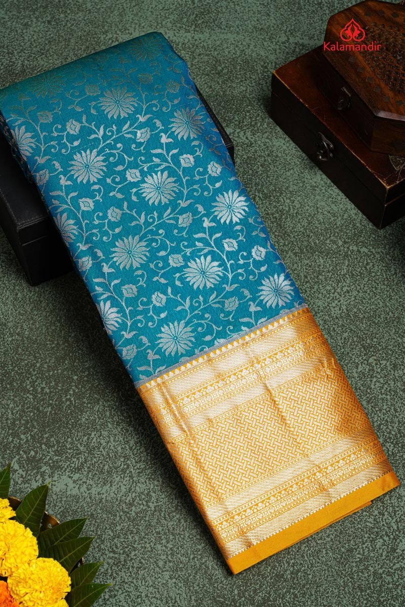 RAMA BLUE and YELLOW FLORAL JAAL SILK Saree with SEMI KANCHIPURAM