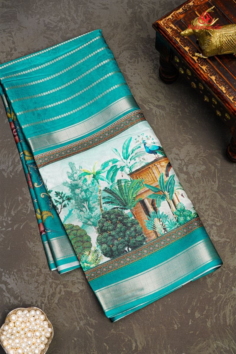 TEAL and MULTI KALAMKARI PRINT SILK Saree with FANCY