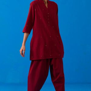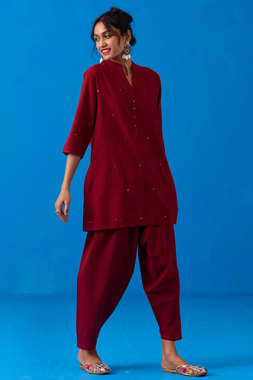 Okhai "Ishqiya" Hand-Embroidery and Mirror Work Maroon Pure Cotton Kurta Salwar Set