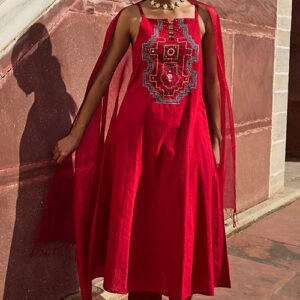 Okhai "Khajuraho" Hand Embroidered Mirror and Beadwork Pure Cotton Sling Kurta Pant Set with Dupatta