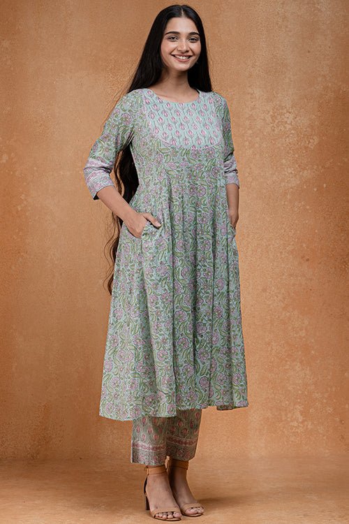 Okhai "Pistachio" Hand Embroidered and Mirrorwork Handblock Printed Pure Cotton Kurta Pant Set